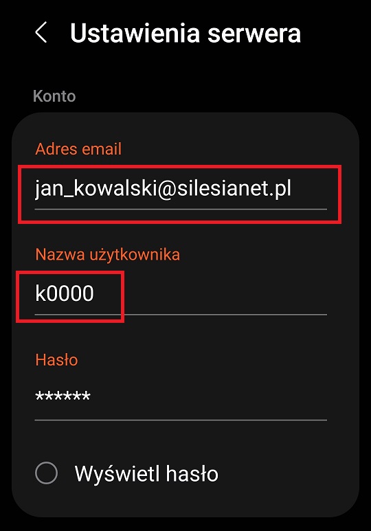 - W ustwieniach serwera wpisz adres email oraz nazwę użytkownika.